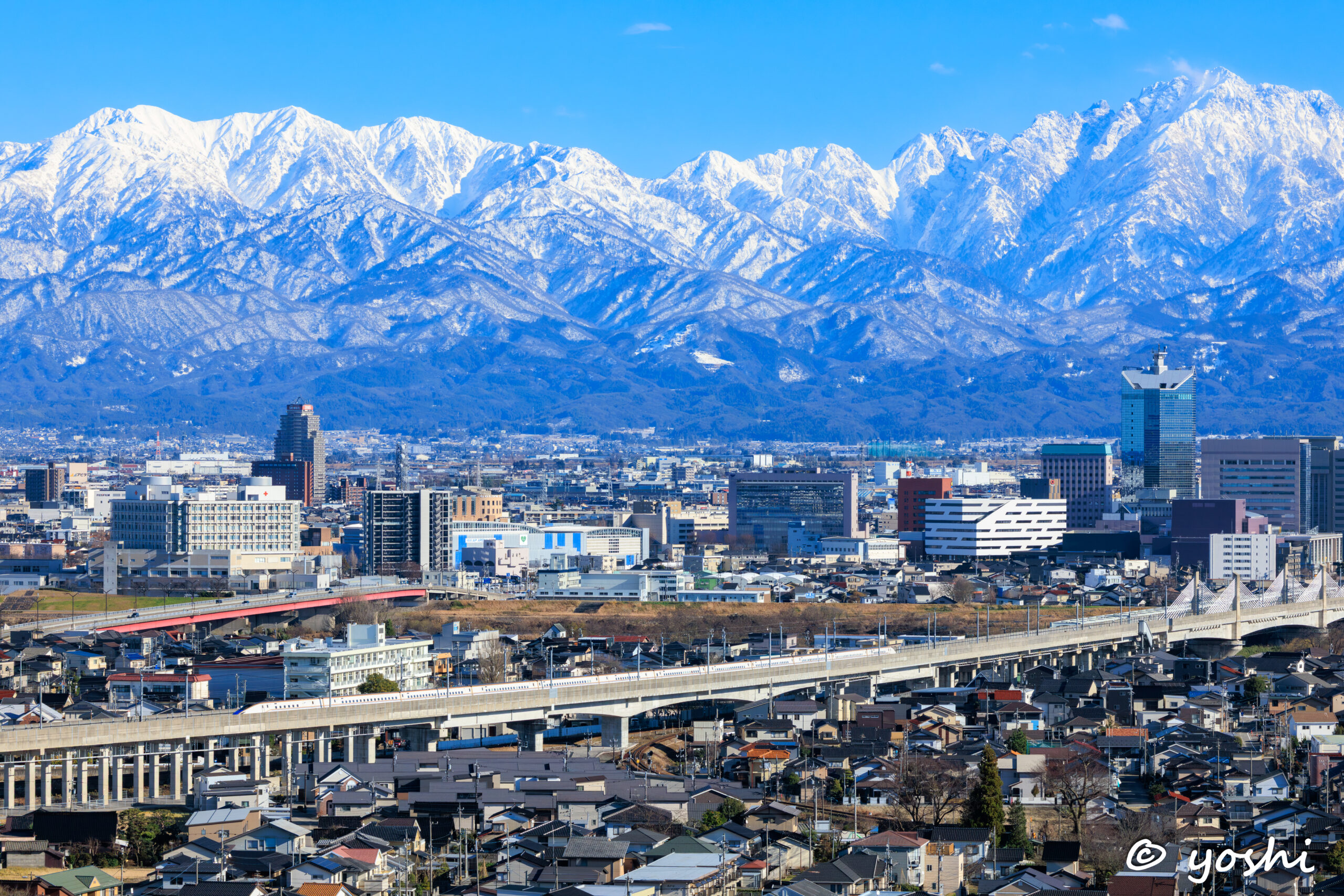 立山連峰を望む呉羽山公園の展望台。展望台付近には駐車場があり、すぐにこの景色が望めます。アクセスも簡単で訪れやすく、富山駅から発着する北陸新幹線とのコラボも楽しめます。画面右上の剱岳はぜひ入れて撮りたいところ。